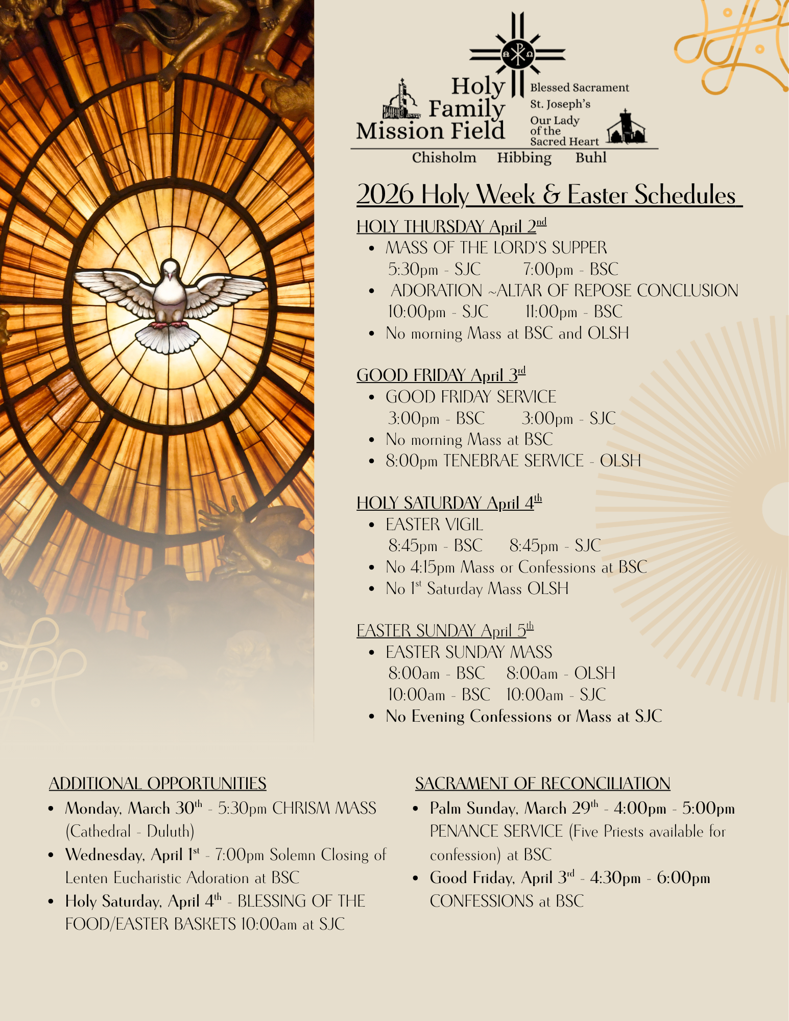 Welcome to St. Joseph's and Our Lady of the Sacred Heart parishes website! Here you will find helpful information about the life of the parish, which is all geared to a strong relationship with Jesus Christ. Our mission is to make Him more loved and known in Chisholm and Buhl and the surrounding areas! Join our parish family on Sundays to worship the Lord in the Celebration of the Eucharist! God bless you.